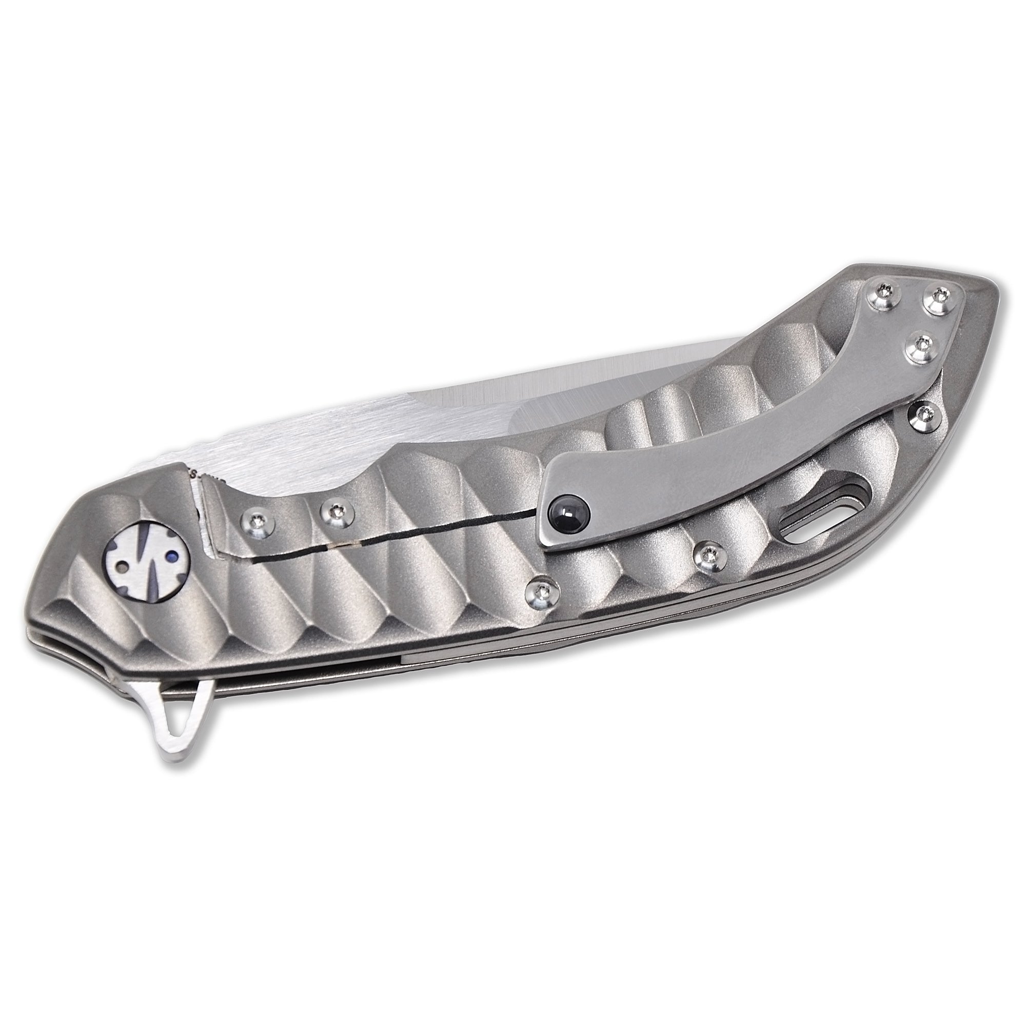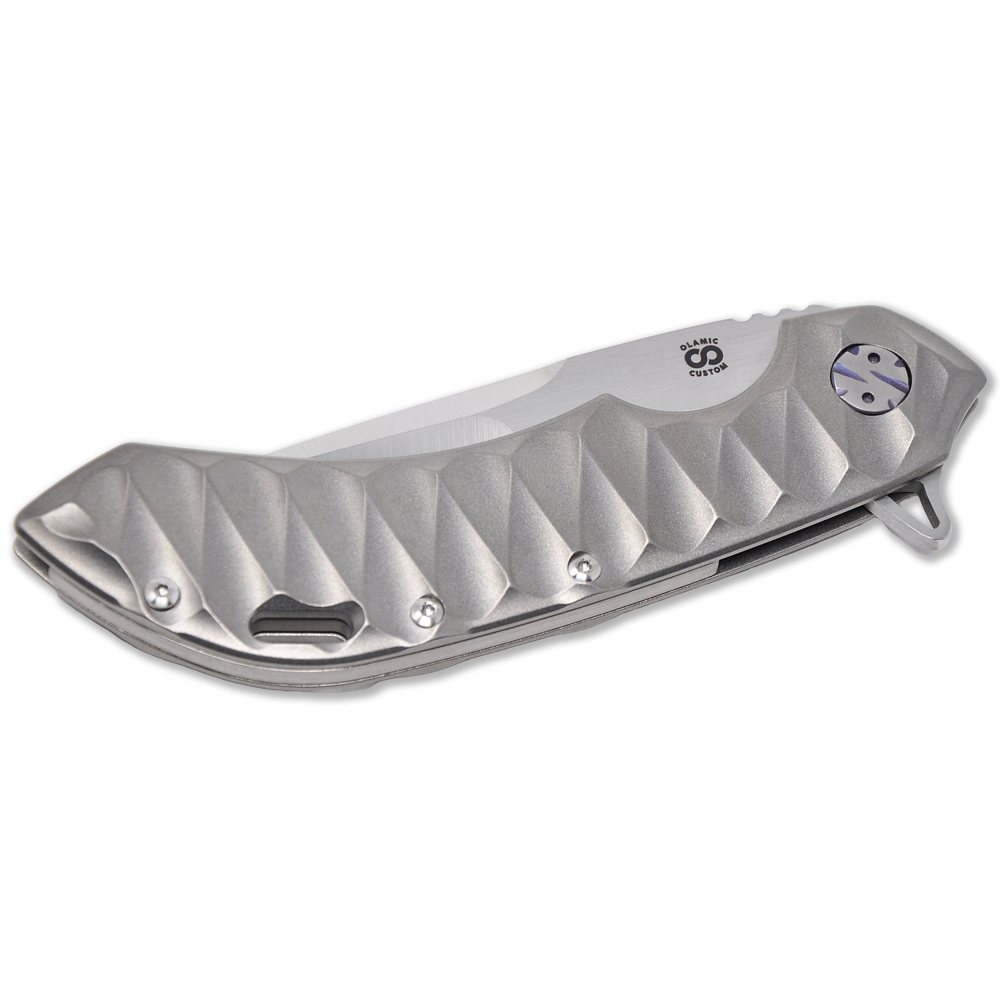Its 6AL-4V titanium handle, Scalloped-milled for texture and control, maintains a clean industrial aesthetic in brushed satin, accented by custom Olamic pivots that make the piece stand out even among other custom pieces.