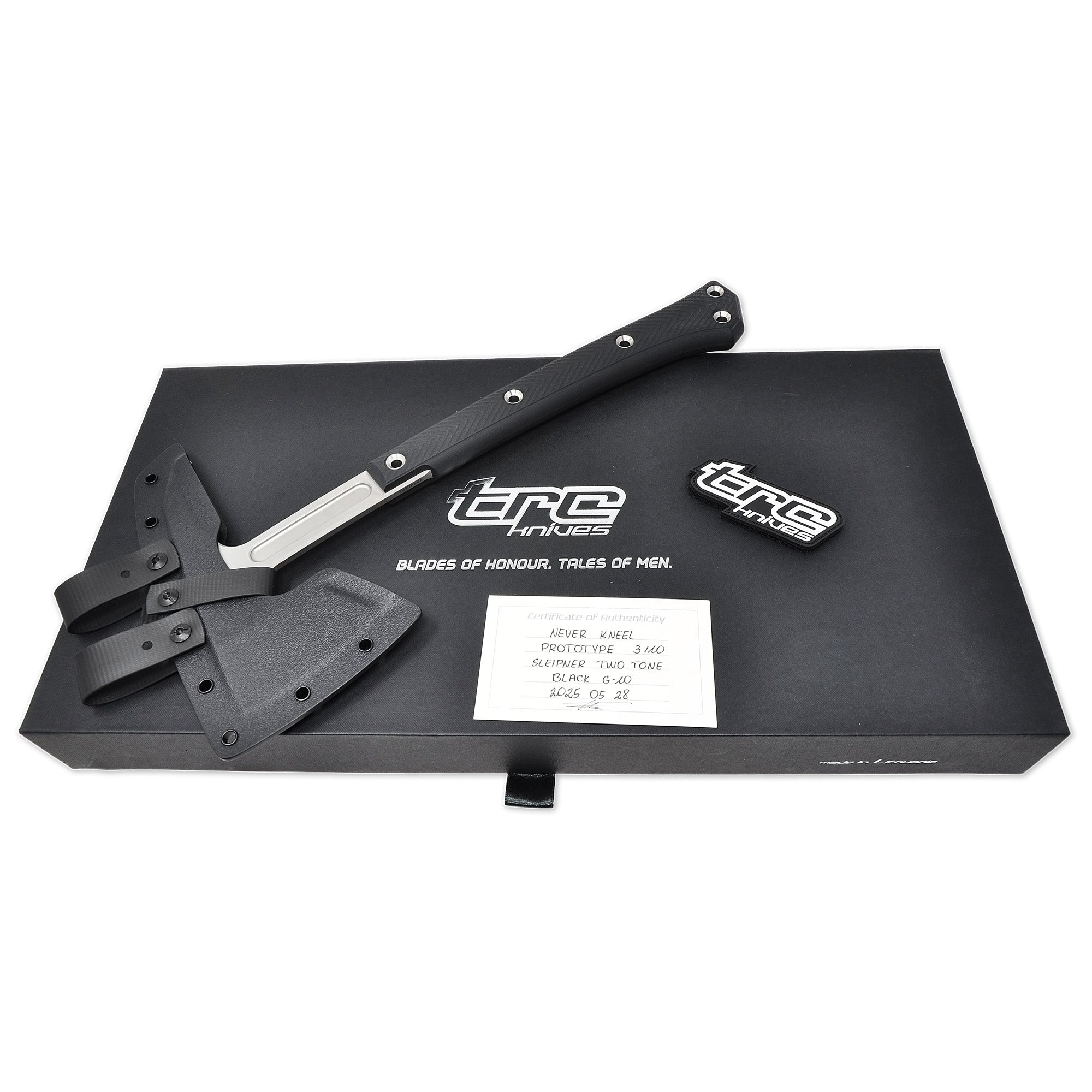 The Never Kneel is TRC Knives' first-ever tomahawk — a Viking-inspired tactical axe, precision-crafted for warriors who never back down. Designed by Andrius Tricius and handmade in Lithuania, this prototype is a rare piece of edged weapon history — only 10 exist.