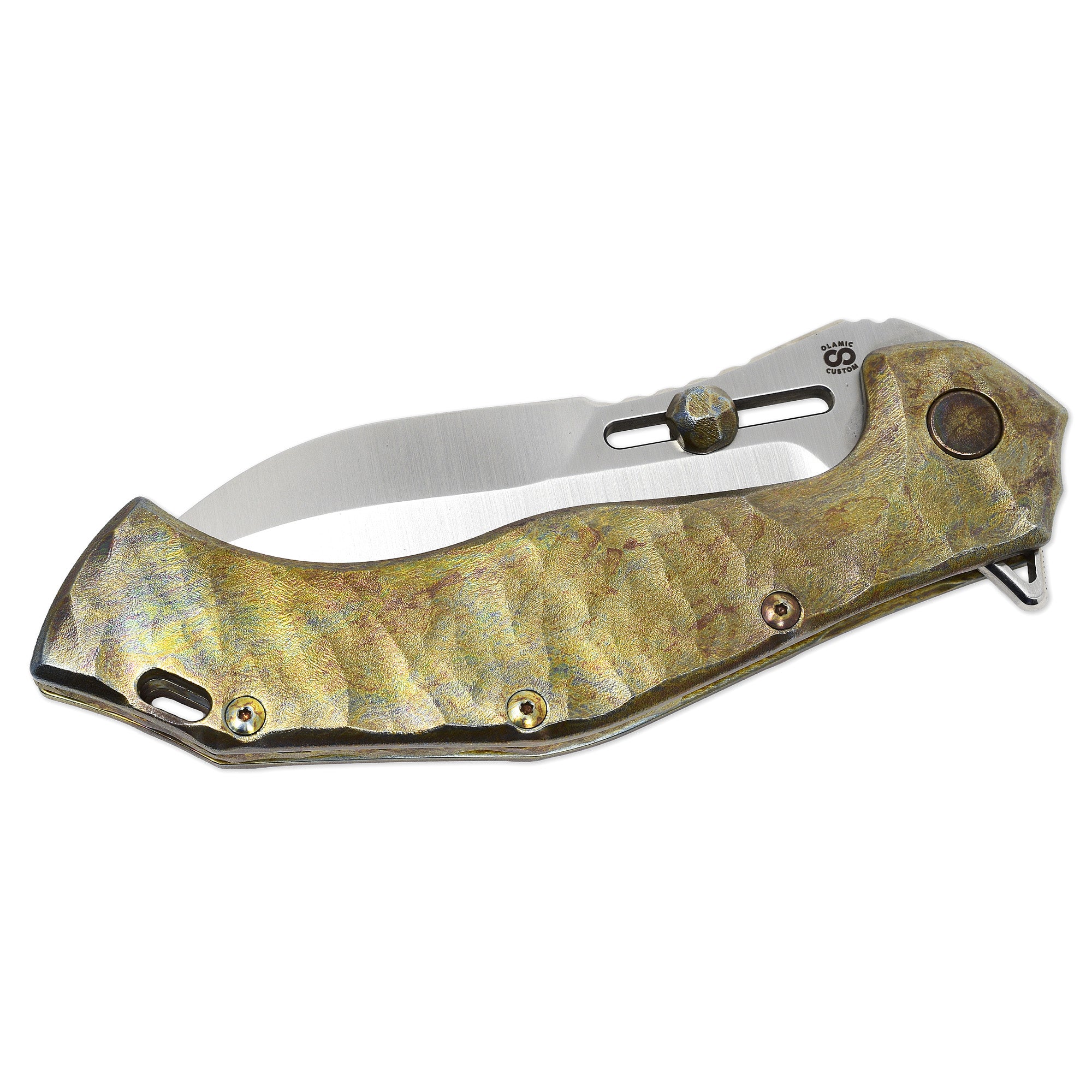 Hand-built and finished in Visalia, California, the Soloist is Olamic’s largest and most aggressive folding platform. This custom configuration features a Böhler M390 Scout-profile blade, offering a versatile mix of piercing control and slicing performance. The adjustable titanium thumb stud allows personalized deployment — reversible, removable, or re-positionable, in classic Olamic fashion.