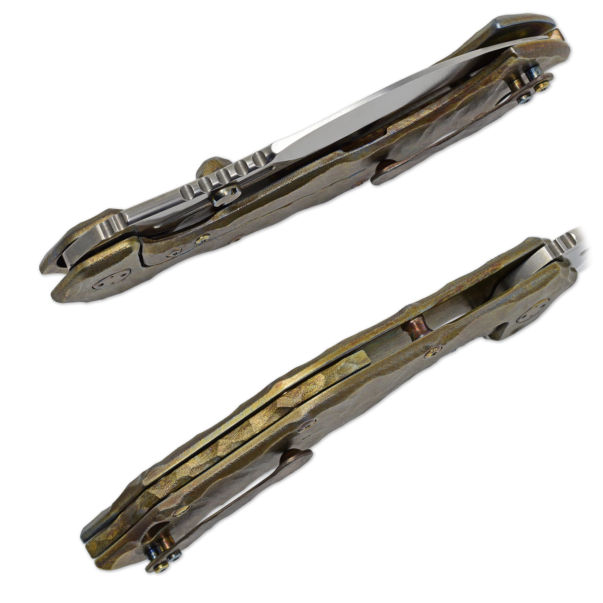 The handle showcases Olamic’s Rocks pattern sculpting across the full titanium frame, anodized in their highly sought-after Neontropic finish — a multi-spectrum coloration that shifts through purples, teals, blues, and golds depending on the light.