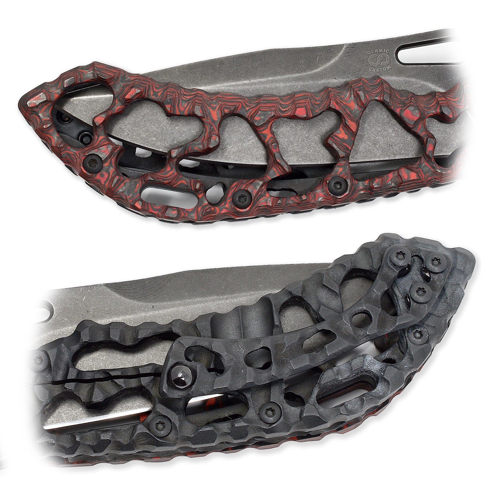 This custom build features a Purist-profile M390 blade, hybrid handle of custom carbon fiber and Aphotic Black titanium, and Olamic’s signature Volcanic Carving with Large Funky Holes — all at an astonishing 3.15 oz.