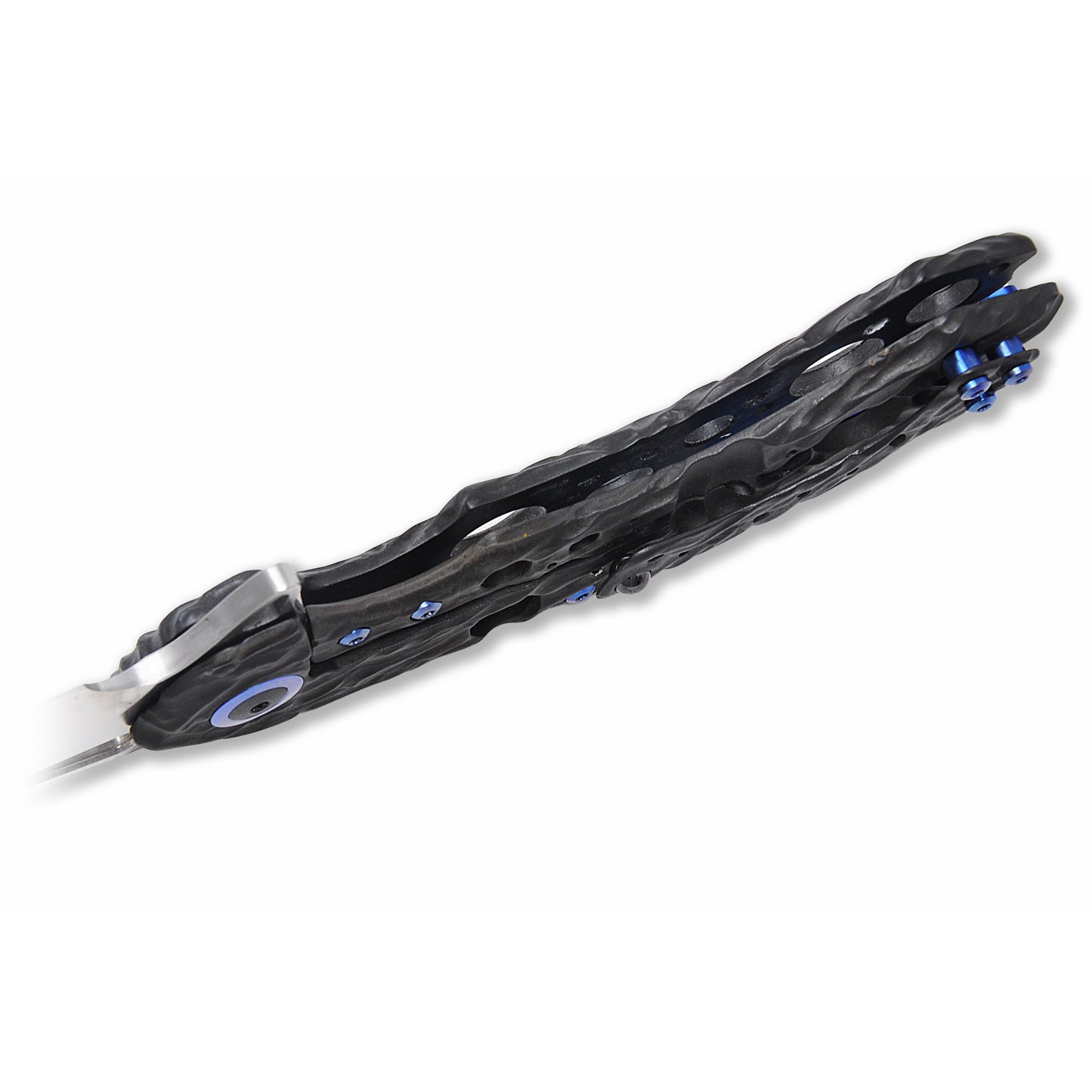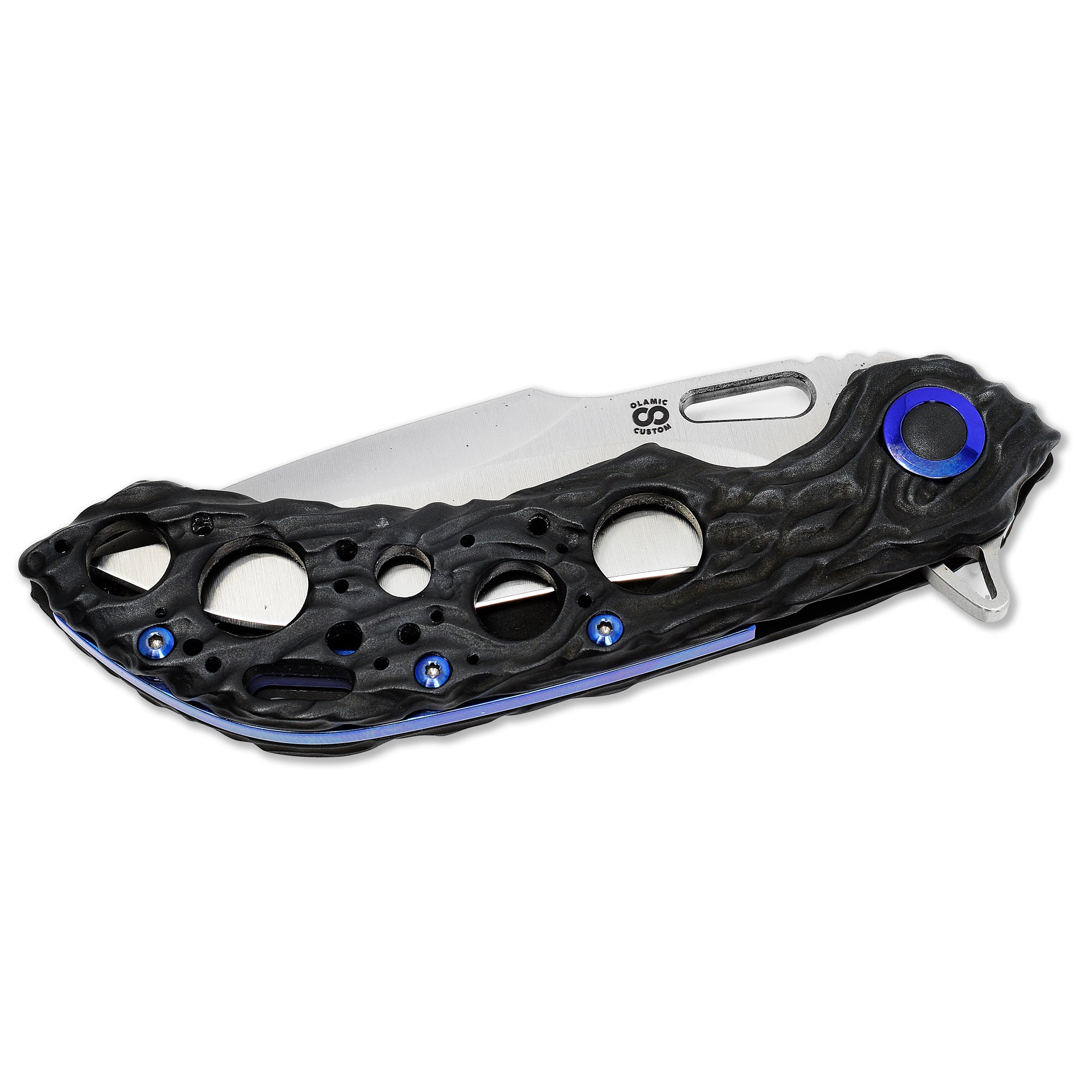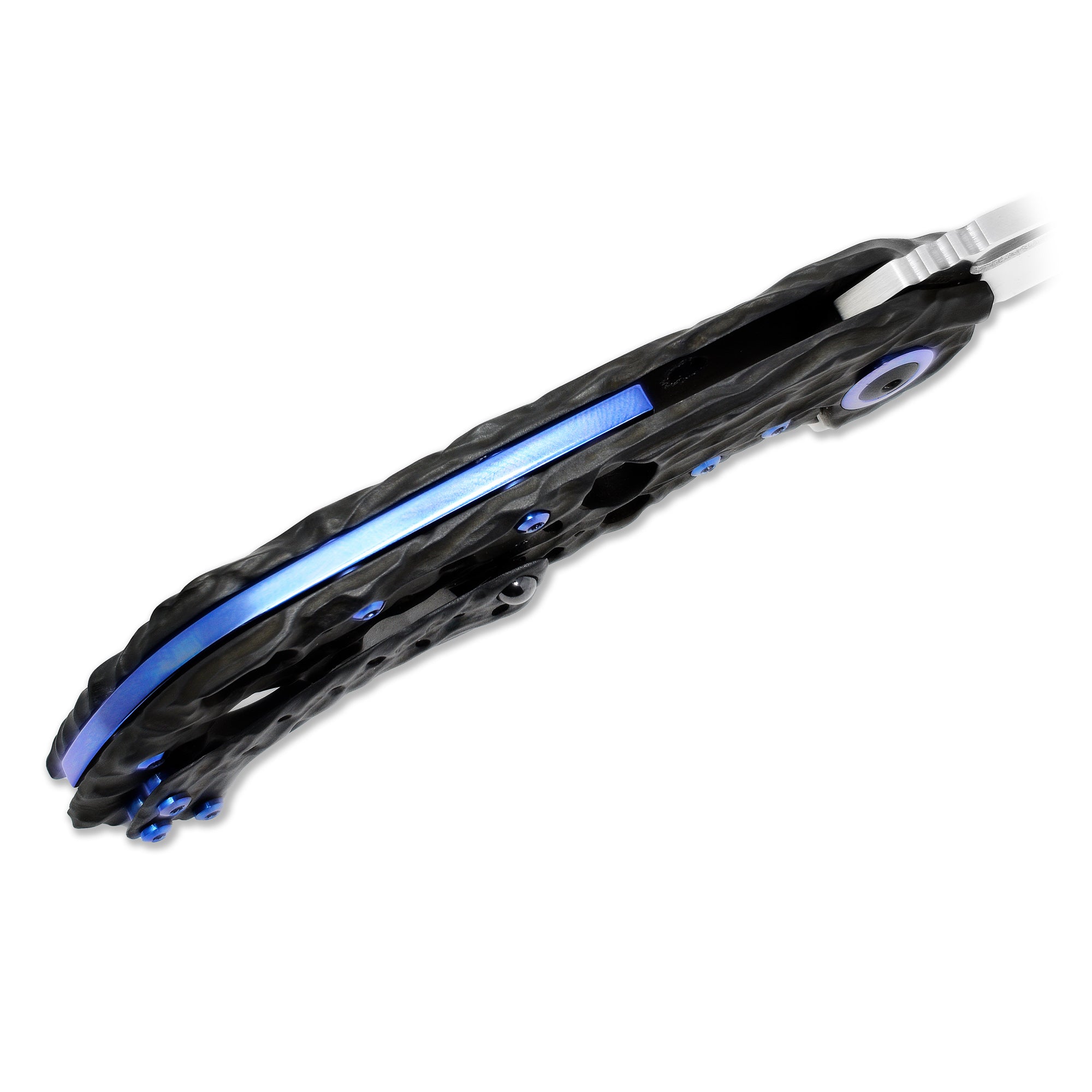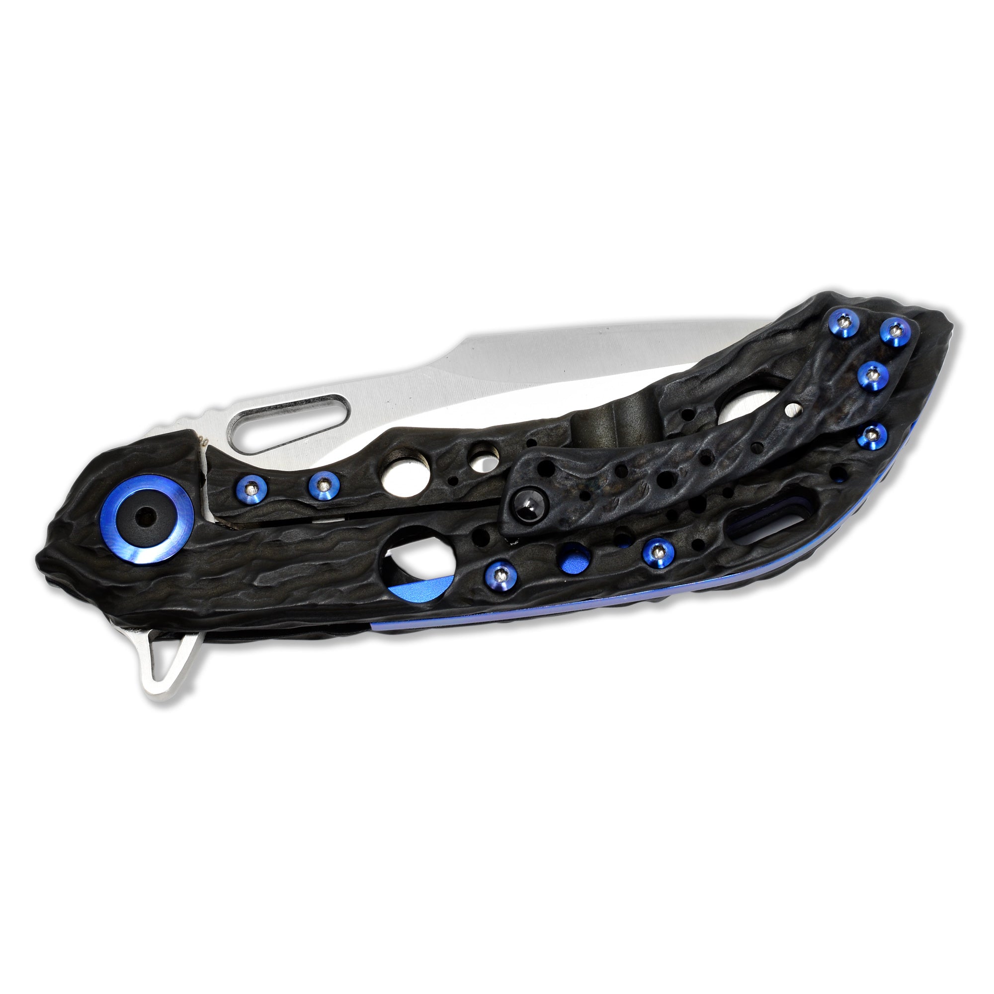 Dark, sculpted, and elevated by bright blue accents — this FlowMolten Wayfarer 247 combines M390 performance with dramatic titanium artistry for a truly collectible custom folder.